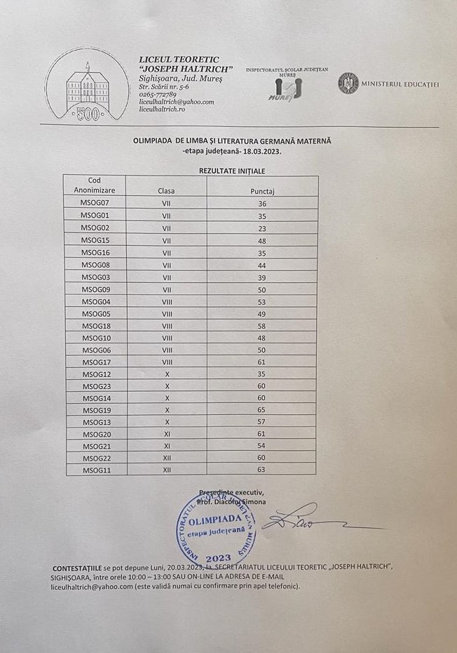 Rezultate OLIMPIADA JUDEȚEANĂ DE LIMBA ȘI LITERATURA GERMANĂ MATERNĂ - 18 martie 2023.